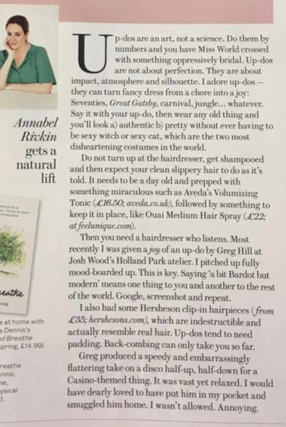 ‘‘Then you need a good hairdresser who listens. Most recently I was given a joy of an up-do by Greg Hill at Josh Wood’s Holland Park atelier.
